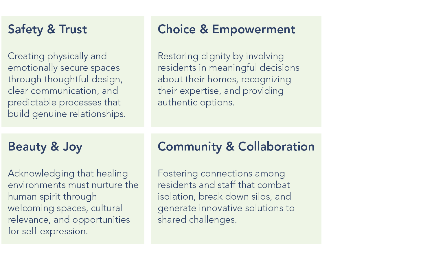 POAH’s Human-Centered Design Best Practices are an extension of our Designing Trauma Resilient Communities project, which utilizes The Missouri Model Principles of Trauma-Informed Care. This model focuses on 5 key principles: safety, trustworthiness, choice, collaboration, and empowerment.